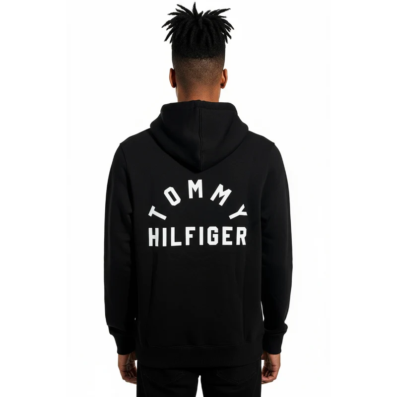 تومى هيلفيغر بطباعة خلفية عملي وأنيق، بخامة مريحة مدعمة بنسبة قطن 10%، تصميم شبابي مثالي للإطلالات اليومية.