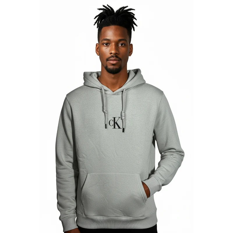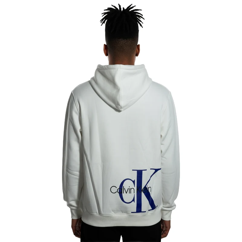Calvin Klein Jeans Back Print CK Hoodie in grey with blue logo. 100% cotton, regular fit, drawstring hood, kangaroo pocket.